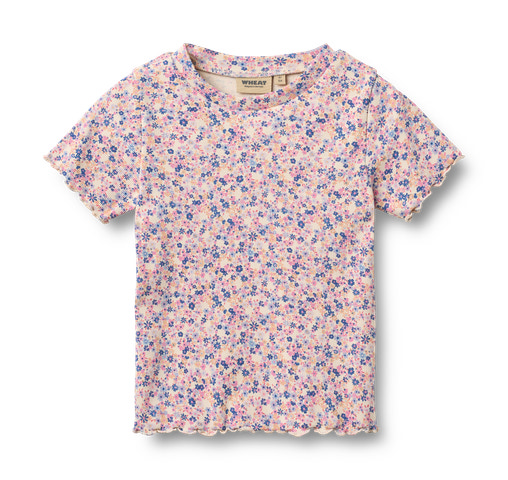 kundeservice@pixizoo.dkAlicia Rib T-Shirt fra Wheat er en blød og behagelig t-shirt med sødt blomsterprint i pink og blå. Den er lavet af 95% bomuld og 5% elastan, hvilket giver god komfort og bevægelsesfrihed. Perfekt til både leg og hverdag!