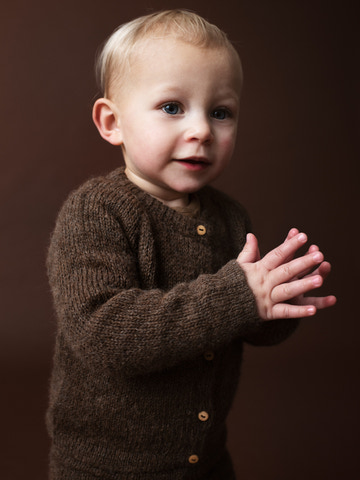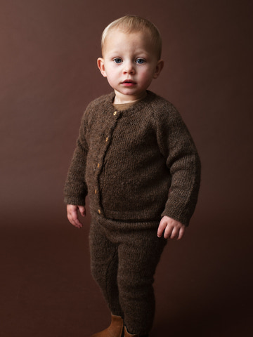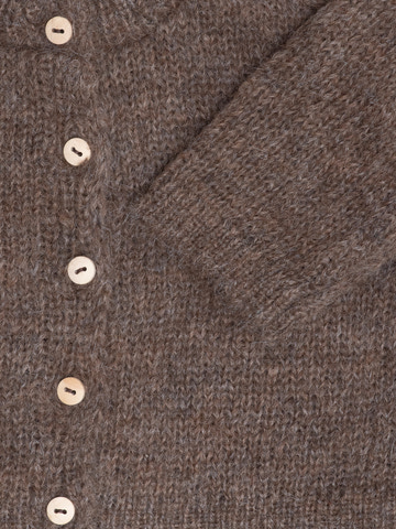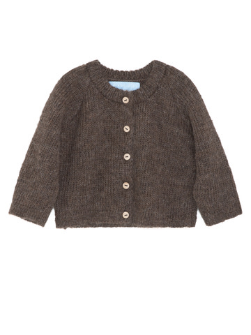 Blød uldcardigan til baby i Suri-alpakauld – en let og luftig kvalitet med lange fibre, som føles meget blød og minder om angora. Mørk grankoglebrun. Design med ribkanter og træknapper. Strikket i mindre familiekooperativer i Bolivia.