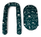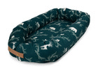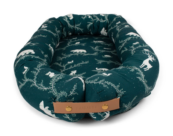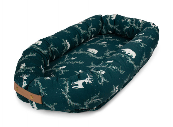 Kanten har et fyld af polyester, og så er babynesten betrukket med økologisk satinvævet bomuld med en dyb og beroligende grøn farve samt hvidt mønster med dyr og natur. Printet Night er en skildring af den nordiske natur med fine grene, en stjernehimmel og vilde dyr. Babynestens betræk kan tages af for at blive vasket, men du skal huske at putte det på igen direkte efter vask og lade det lufttørre for at undgå, at det krymper.