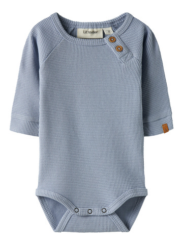 Balto langærmet body fra Lil' Atelier i Zen Blue er lavet af blød, økologisk bomuld. Perfekt til sart babyhud og nem at tage af og på med trykknapper.