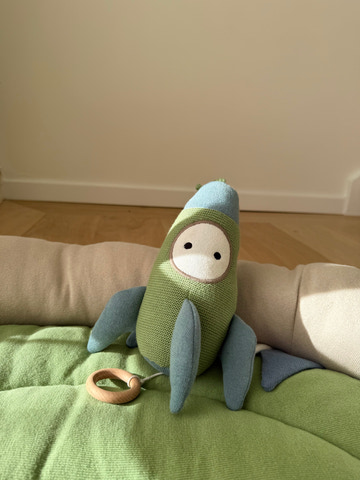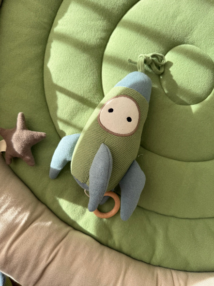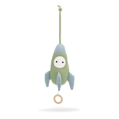 Sød bamse med musik fra Vanilla COPENHAGEN formet som en raket. Perfekt til at skabe ro og hygge ved puttetid. Træk i ringen og nyd den blide melodi.