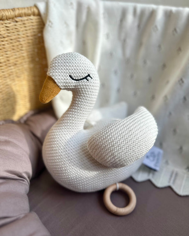 Little Swan er en økologisk strikket krammebamse, der er både sød og blød, og den spiller rolig musik. Med dens dinglende ben og søde smil bliver Little Swan hurtigt en af dit barns yndlingsbamser. Når du trækker i træringen, begynder den at spille en fin og beroligende vuggevise, der hedder "Sleep baby, sleep", som kan hjælpe enhver baby med at slappe af.