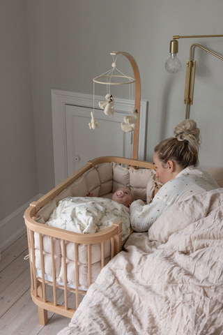 Nyfødte vågner ofte flere gange i løbet af natten. Med Sebra Bedside Crib har du altid din baby tæt på – uden at skulle forlade din varme dyne. Du kan nemt trøste, give sutten eller berolige barnet, uden at stå op og blive helt vågen. Dit barn sover trygt i sin egen seng, men lige ved siden af dig, så du slipper for bekymringen om at rulle over barnet i søvne. Det giver både ro og bedre nattesøvn for jer begge.