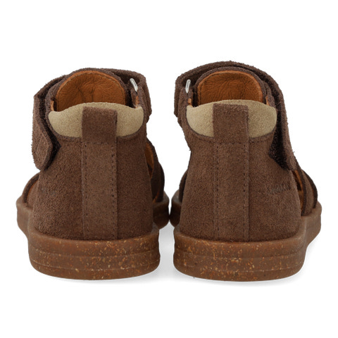 Begyndersandal i ruskind. Sandalen har en justerbar velcro for optimal pasform. Derudover har den en lukket tå, polstret indersål, kromfrit læderfoer, en fast hælkappe og en polstret krave for ekstra komfort og støtte. Sandalens sål er en let og fleksibel gummi- og korksål.