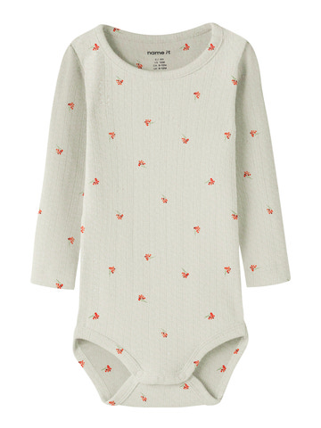 Berries langærmet body fra NAME IT er blød og behagelig for de mindste. Lavet i 95% bomuld og 5% elastan, så den er både strækbar og komfortabel. Den søde Peyote Melange farve og små bær gør den ekstra fin.