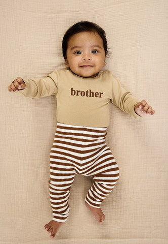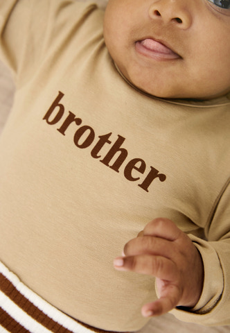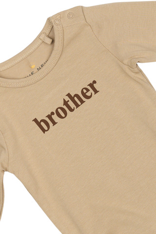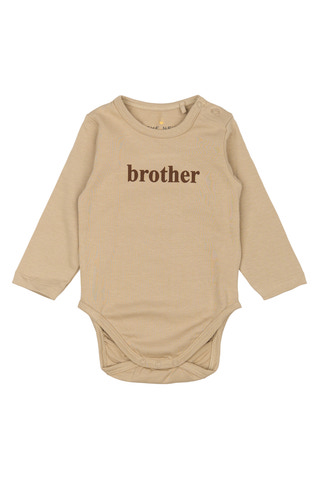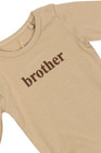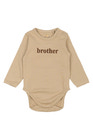 Langærmet babystocking med teksten ""brother"". Bodystockingen fra THE NEW siblings er i en lys sandfarve med brun tekst. GOTS Økologisk certificeret af CU842535