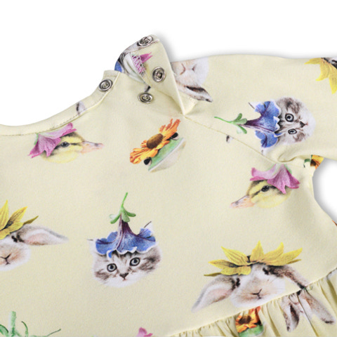 Charmaine Kjole - Floral Fun Baby fra Molo er en sød og blød kjole i økologisk bomuld og elastan. Kjolen har et sjovt blomsterprint med små dyr, som børn vil elske. Perfekt til både leg og fest!