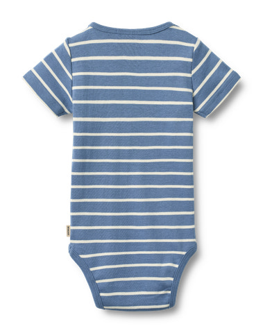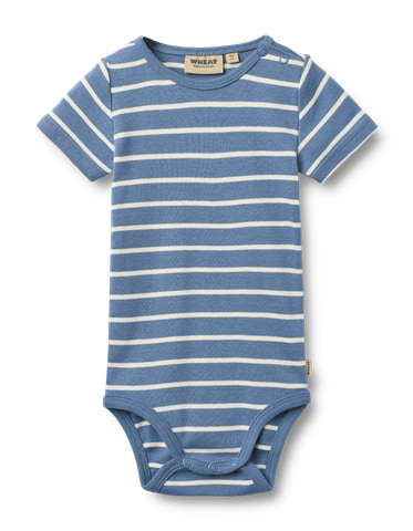 Edvald Kortærmet Body fra Wheat er lavet i blød økologisk bomuld, perfekt til dit barns sarte hud. Den fine blåstribede body har praktiske trykknapper ved skulder og mellem benene, så den er nem at tage af og på.