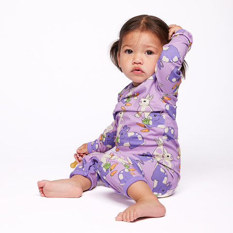 Elstar heldragt fra Småfolk er lavet i blød bomuld og har et sødt kanin- og blomsterprint, der gør den ekstra sjov at have på. Perfekt til både leg og søvn.