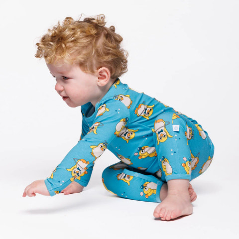 Lad legesyge cirkuspingviner tilføje et strejf af lune og charme til din babys outfit. Småfolks print er tegnet med fokus på glade farver, detaljer og historier. Vores heldragter til babyer er en god måde at tilføje personlighed til dit barns garderobe, samtidig med at dit barn kan føle sig komfortabel hele dagen.