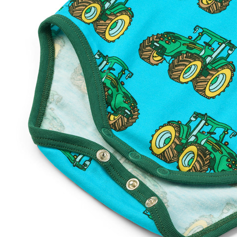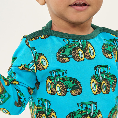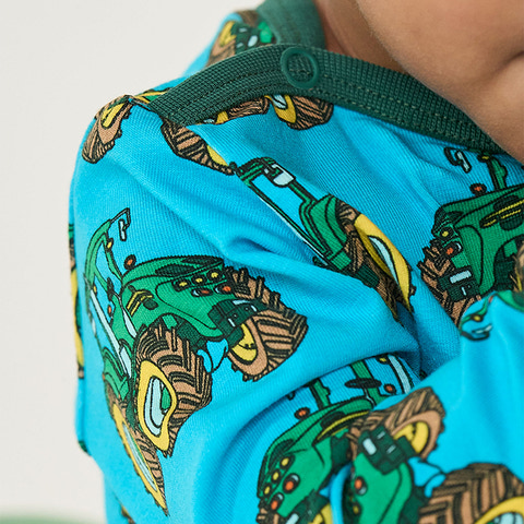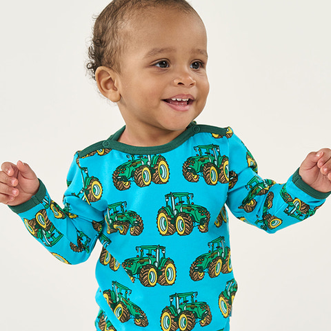 Langærmet baby body med traktor produceret i en økologisk og strækbar bomuldsjersey. Denne body er OEKO-TEX Standard 100® certificeret, hvilket betyder at denne body er produceret og testet for skadelige stoffer, så du kan passe på dit barns hud og helbred.Denne body har en normal pasform med kuvertlukning og trykknapper, samt ribkant i hals og ærmer. Småfolks body'er er designet i Danmark med tanke på at kunne holde til utallige eventyrer og leg, og bevare form og farver selv efter gentagen brug.