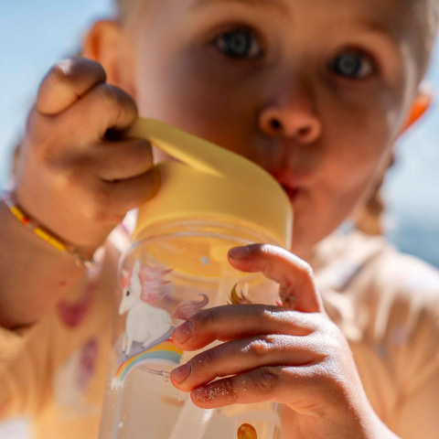 Hvad enten det er til en dag i skolen, en picnic i parken eller små eventyr i hverdagen, er denne drikkedunk en tryg og let følgesvend for små opdagelsesrejsende. Den ligger let i små hænder og passer ned i enhver rygsæk. Og når den sidste dråbe er drukket, er den så let som en fjer - klar til at blive båret hjem igen. Drikkedunken er fremstillet af klart, slidstærkt PET-plast, der er testet og godkendt til fødevarer. Den rummer op til 400 ml, og det transparente design gør det nemt for barnet at se, hvad der er indeni - perfekt til hverdagens små og store oplevelser.