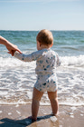 Skyl badetøjet grundigt under rindende vand efter brug, ellers kan farverne falme. Undgå at vride badetøjet, da dette kan reducere UV-beskyttelsen, og lad altid badetøjet tørre i skyggen, da direkte sollys kan forkorte plaggets holdbarhed.