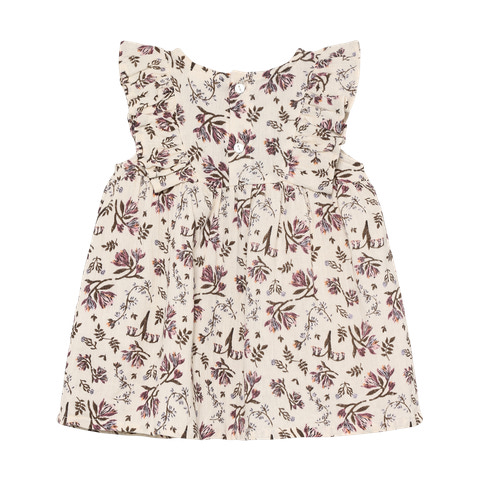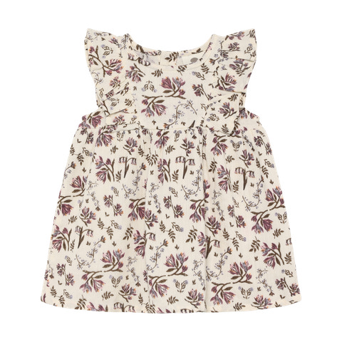 Den lyse eggnog‑farve fungerer som en smuk base for de delikate blomster, der pryder kjolen og giver den et sommerligt look. Kjolen har en klassisk pasform med god vidde, så barnet kan bevæge sig frit og ubesværet. De søde flæser på skuldrene tilfører et ekstra strejf af elegance, og kjolen er nem at tage af og på, hvilket gør den praktisk i hverdagen.