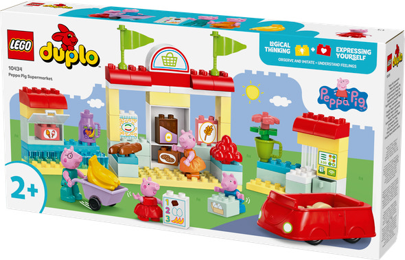 Inviter piger og drenge fra 2 år til at lege rollelege om en indkøbstur til butikken med LEGO® DUPLO® legetøj Gurli Gris i supermarkedet (10434). De små børn kan deltage i familiens rutiner, når de kører afsted for at købe mad i den ikoniske røde bil fra tv-serien. Dette bygge- og ombygningslegetøj til de mindste er fyldt med tilbehør, der sætter gang i den kreative rolleleg. Med de 4 figurer – Gurli Gris, Gustav, Mor Gris og Far Gris – kan tumlingerne både lege, at de er forældrene og børnene. Børnehavebørn vil genkende elementer fra virkelighedens købmandsbutikker, såsom selvscanningskassen, indkøbsvognen og køleskabet. LEGO DUPLO Gurli Gris læringslegetøjet hjælper små børn med at udvikle færdigheder, når de tænker logisk, mens de udspiller shoppingture inspireret af tv-serien. Familier kan også udforske følelser gennem leg. Den relaterbare scene vil sætte gang i samtaler mellem voksne og de mindste om adfærd i butikken og – måske endnu vigtigere – hvem der får lov til at skubbe vognen!