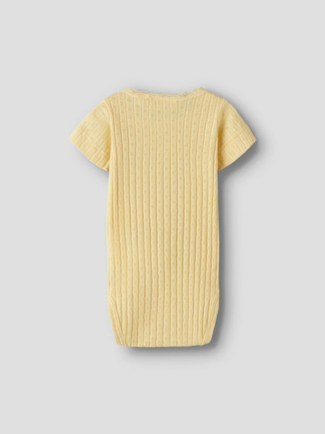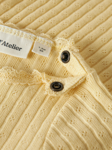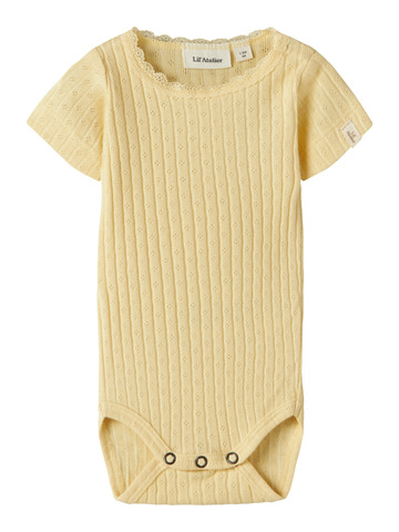 Haldis Kortærmet Slim Body fra Lil' Atelier er lavet i blød bomuld, som er behagelig for dit barn at have på. Den fine gule farve og det søde hulmønster gør bodyen ekstra charmerende.