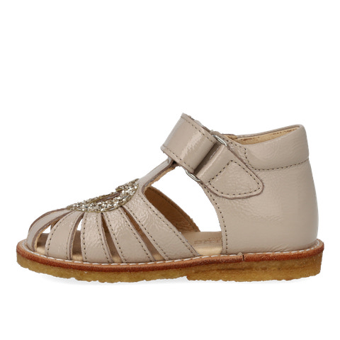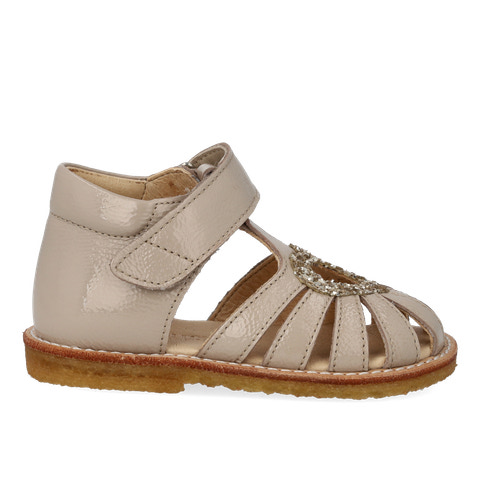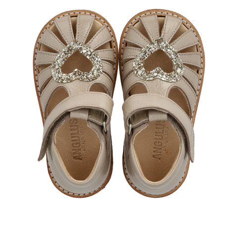 Fin sandal med et funklende glimmerhjerte. Sandalen har justerbar velcro for optimal pasform. Den har en lukket tå, polstret indersål, kromfrit læderfoer, en fast hælkappe og polstret krave for ekstra komfort og støtte. Sålen er en let, blød og fleksibel crepegummisål i vedvarende naturgummisnit med fokus på svangstøtte. Sandalen er fremstillet i naturligt og åndbart læder med lærredsbaseret glitter.