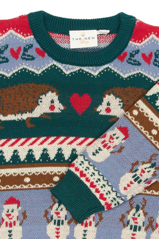 Denne julesweater fra THE NEW Siblings sprudler af charme og vinterstemning. Med farverige og detaljerede motiver som pindsvin, snemænd, hjerter og klassiske juledetaljer, er den et festligt valg til både hverdag og særlige lejligheder i feriesæsonen. Den bløde strik og ribkanter ved hals, ærmer og kant sikrer en behagelig pasform – perfekt til julehygge og vintersammenkomster.