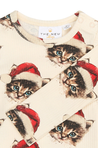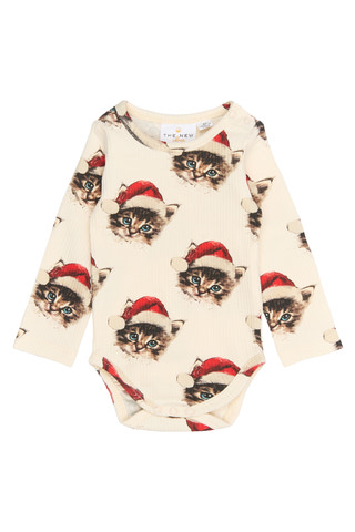 TNSBHoliday Rib Body fra THE NEW Siblings er en charmerende og sjov tilføjelse til vintergarderoben. Denne body fås i to festlige varianter – én med katte iført nissehuer og én med dinosaurer klædt til højtiden – begge med legende all-over prints, der skaber en hyggelig og humoristisk stemning. Den slanke pasform og de praktiske trykknapper ved skulder og bund gør den nem at få af og på, samtidig med at den sikrer en blød og behagelig fornemmelse mod huden.