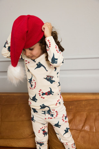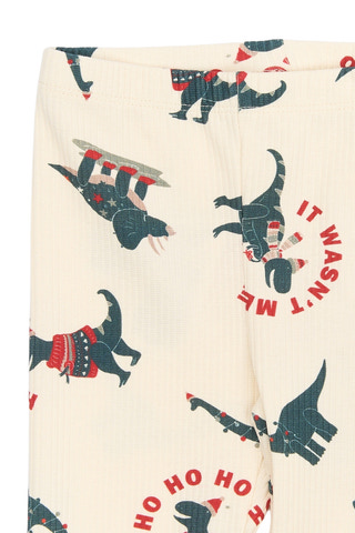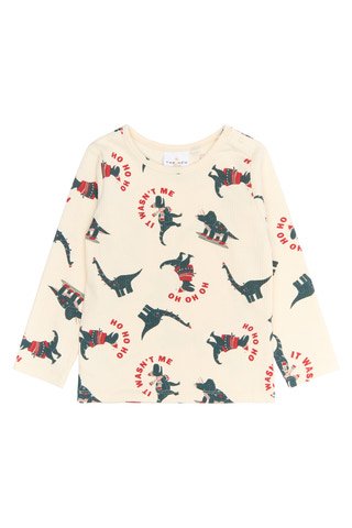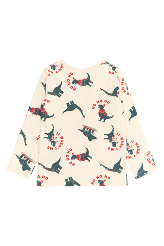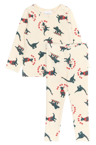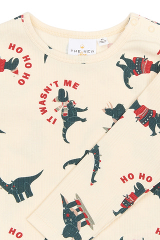 Dette pyjamassæt fra THE NEW Siblings er både hyggeligt og festligt – ideelt til sengetid i feriesæsonen. Sættet består af en langærmet top og matchende bukser i blødt, ribbet materiale med masser af stretch for maksimal komfort. Vælg mellem to sjove all-over prints: katte med nissehuer eller dinosaurer i juletøj – begge perfekte til hyggelige aftener og langsomme morgener i december.