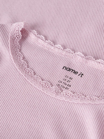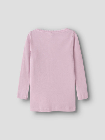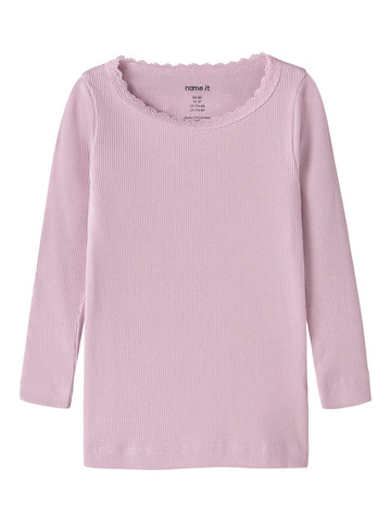 Sød langærmet bluse i rib med en lille blondekant i halsen. Blusen er fremstillet af en blanding af økologisk bomuld og modal, som tilsammen givet et blødt og behageligt materiale samtidig med en fantastisk pasform.