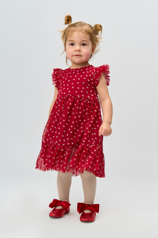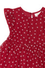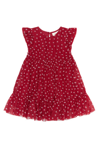 Denne kjole fra THE NEW Siblings er skabt til festlige stunder og leg med sit romantiske og fantasifulde design. Den er fremstillet i lagdelt, let tyl med et fint all-over hjerteprint, og de charmerende flæsedetaljer ved ærmer og nederkant tilføjer et ekstra strejf af magi. Den brede nederdel og luftige fornemmelse skaber en smuk silhuet, der bevæger sig elegant – perfekt til alt fra fødselsdage til udklædningsdage.