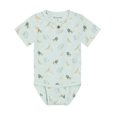 Minymo Kortærmet Body m. Print - Sprout Green er en skøn body til de mindste, der kombinerer komfort og et charmerende design. Bodyen er fremstillet i et blødt og strækbart materiale, der sikrer, at dit barn kan bevæge sig frit og ubesværet hele dagen. Det fine print med løver, giraffer og elefanter bringer et legende og eventyrligt udtryk, som både børn og forældre vil elske. Den kortærmede model er ideel til de varmere måneder eller som et lag under andet tøj. Bodyen har praktiske trykknapper i bunden, hvilket gør det nemt og hurtigt at skifte ble, og en enkelt knap foran ved halsen, der letter påklædningen. Den bløde ribkant ved hals og ben sikrer en god pasform og ekstra komfort for barnet.