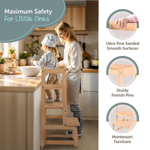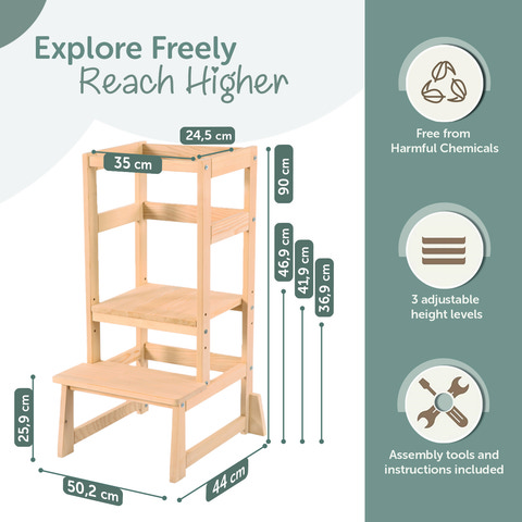 Med Kukka læringstårnet lærer dit barn ved at efterligne dig, mens I nyder tiden sammen derhjemme. Læringstårnet hjælper dit barn med at tilegne sig madlavningsfærdigheder og forvandler dit køkken til et læringsområde ved at hæve det til bordhøjde. Dit barn vil tilegne sig selvplejefærdigheder såsom at vaske hænder, børste tænder, vaske frugt og grøntsager sammen med dig og hjælpe dig med dine daglige gøremål. - passer perfekt til dit køkkenbord eller din vask i en ret vinkel. Dens stilfulde udseende og dimensioner gør det muligt at placere den næsten hvor som helst i dit hjem og bruge den i mange år.