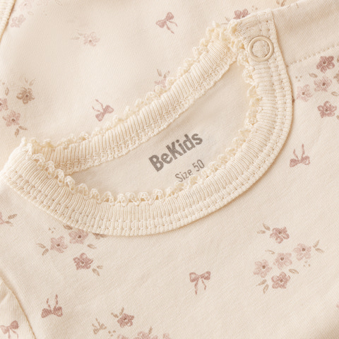 Bodyen er fremstillet i en blød bomuldsblanding og prydet med et fint blomstermønster over hele stoffet. De elegante pufærmer giver et ekstra feminint touch. Bodyen lukkes nemt med trykknapper på skulderen og mellem benene for hurtig på- og afklædning.