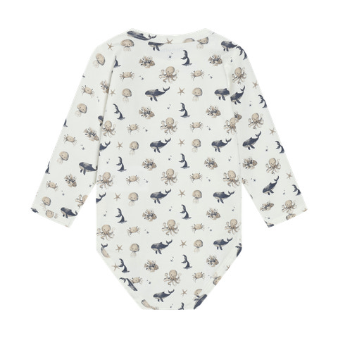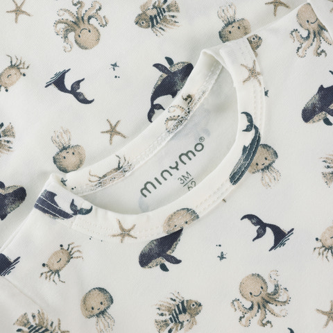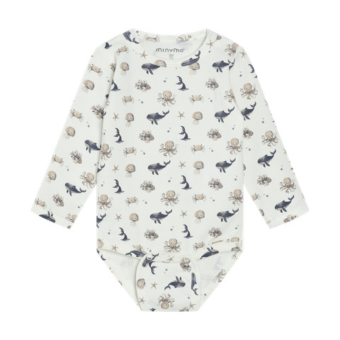 Minymo Langærmet Body m. Print i farven White Pepper er et skønt valg til de mindste. Bodyen har et charmerende print med havdyr, der gør den ekstra fin og sjov for barnet at have på. Den er designet med lange ærmer, hvilket gør den ideel til både kølige og milde dage, og sikrer at barnet holdes varmt og komfortabelt. Bodyen er fremstillet i et blødt og strækbart materiale, der giver god bevægelsesfrihed og føles behageligt mod huden. Den har praktiske trykknapper i bunden, som gør det nemt og hurtigt at skifte ble - enkelt og bekvemt. Bodyen er velegnet både som inderste lag under andet tøj eller alene på varme dage.