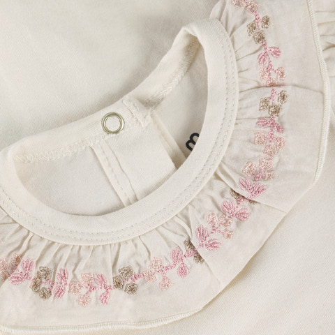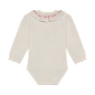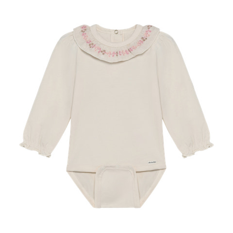 Minymo Langærmet Body - White Swan er en yndig og komfortabel body til de mindste. Den er fremstillet i en blød og lækker kvalitet, der føles behagelig mod barnets hud. Bodyen har lange ærmer og en smuk flæsekrave med fine, broderede blomster, som giver et elegant udtryk. Praktiske trykknapper i nakken og mellem benene gør det nemt at tage bodyen af og på, samt skifte ble. Perfekt til både hverdag og festlige lejligheder, hvor barnet skal være ekstra fint klædt på. Bodyen kan nemt kombineres med bukser eller nederdel for et sødt look.