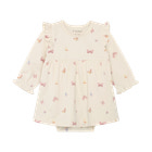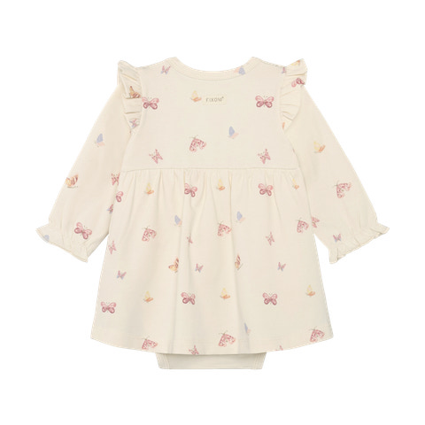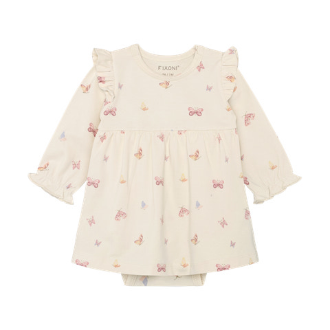 kundeservice@pixizoo.dkLangærmet Bodykjole fra Fixoni i den fine farve Bleached Mauve er et skønt valg til de mindste. Kjolen har et yndigt sommerfugleprint og søde flæser på skuldrene, som giver et feminint og legende udtryk. Den bløde kvalitet sikrer komfort hele dagen, og den praktiske trykknaplukning i bunden gør det nemt at skifte ble. Bodykjolen kombinerer kjolens søde look med bodyens funktionalitet, så dit barn både ser fint ud og har fri bevægelighed. Perfekt til både hverdag og festlige lejligheder, hvor komfort og stil går hånd i hånd.