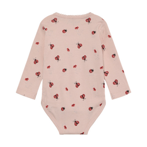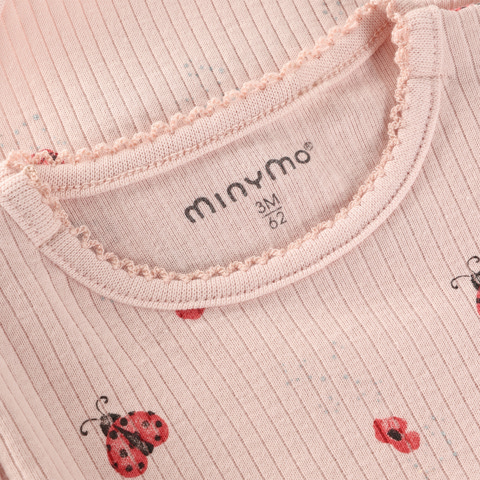 Langærmet Rib Body m. Print fra Minymo i farven Peach Whip er et skønt valg til de mindste. Den bløde ribstruktur sikrer, at bodyen sidder behageligt mod barnets hud og giver god bevægelsesfrihed. Det fine print med mariehøns tilføjer et legende og sødt udtryk, som passer perfekt til både hverdag og festlige lejligheder. Bodyen har praktiske trykknapper i bunden, hvilket gør det nemt og hurtigt at skifte ble. Det langærmede design beskytter barnets arme og er ideelt til overgangsperioder eller som et ekstra lag under tøjet. Minymo er kendt for deres fokus på kvalitet og funktionalitet, så du kan trygt vælge denne body til dit barn.