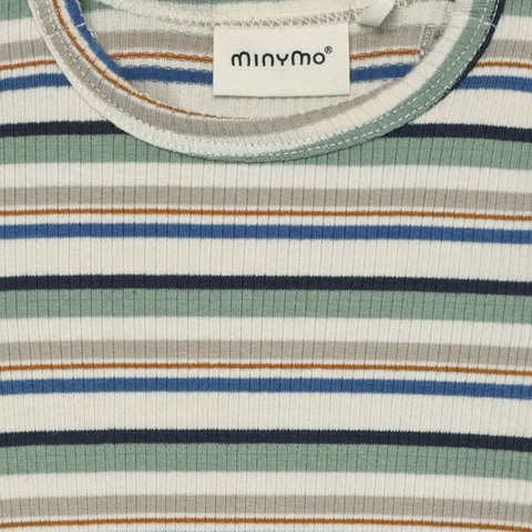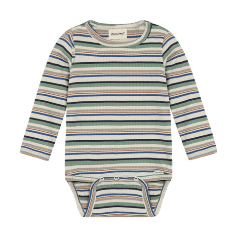 Den langærmede rib body med striber fra Minymo er et skønt valg til både baby og tumling. Bodyen er fremstillet i en blød og elastisk ribkvalitet, der sikrer god bevægelsesfrihed og komfort hele dagen. De klassiske striber giver et tidløst look, som passer til enhver garderobe. Bodyen har praktiske trykknapper ved skulderen og mellem benene, hvilket gør det nemt at klæde barnet på og skifte ble. Perfekt til både leg og afslapning, og kan bruges alene eller som et varmt lag under andet tøj.