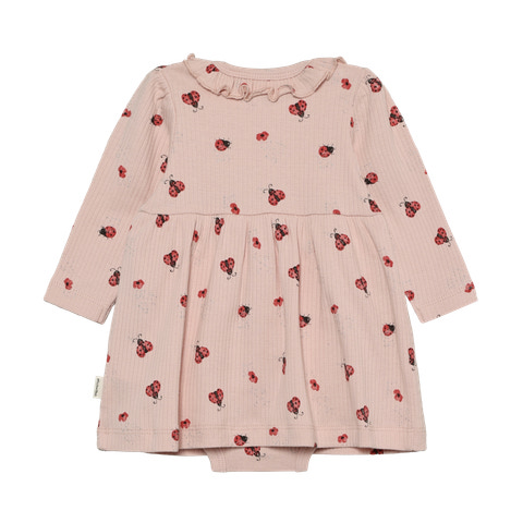 Langærmet Rib Bodykjole m. Print fra Minymo i farven Peach Whip er et skønt valg til de mindste. Kjolen kombinerer det praktiske ved en body med det fine udtryk fra en kjole, så dit barn både er komfortabelt og velklædt. Den bløde ribkvalitet sikrer god bevægelsesfrihed, og det søde mariehøneprint giver et charmerende og legende look. Trykknapperne ved skulderen og i bunden gør det nemt at klæde barnet på og af, hvilket er en stor fordel i hverdagen. Kjolen er ideel til både leg og hygge, og kan nemt styles med strømpebukser eller leggings for et fuldendt outfit.