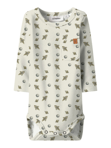 kundeservice@pixizoo.dkLayo Geo Langærmet Body fra Lil' Atelier i farven Turtledove er et skønt valg til de mindste. Bodyen har et charmerende print med raketter og planeter, der gør den ekstra sjov og hyggelig. Den bløde kvalitet sikrer komfort hele dagen, og de lange ærmer giver god varme på kølige dage. Med trykknapper i bunden er det nemt at skifte ble, og den lille brystlomme med mærke tilføjer et fint, unikt touch. Perfekt til både hverdag og leg, hvor barnet kan bevæge sig frit og komfortabelt.