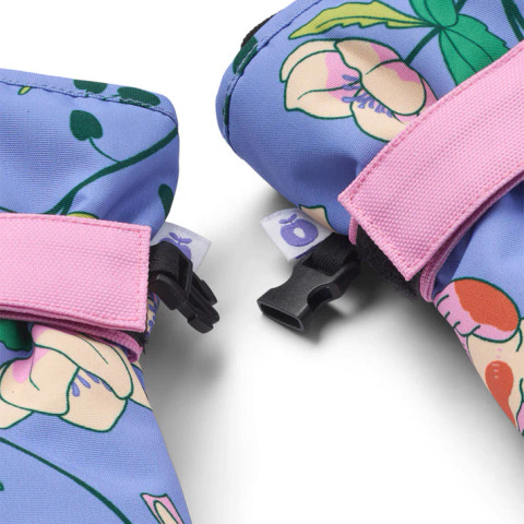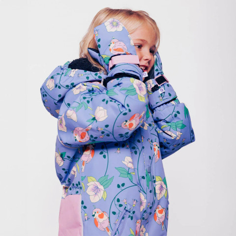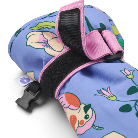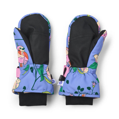 Luffer med fugle og blomster. Disse luffer har en justerbar velcrostrop ved håndledet og kan klipses sammen med et spænde. Handskerne har slidstærk belægning i i håndfladen og rib ved håndleddene, der forhindre kold vind og sne fra at trænge ind.