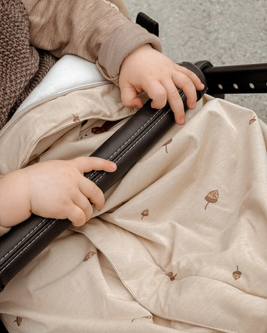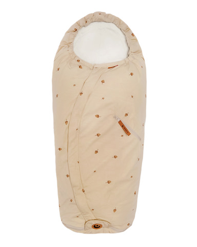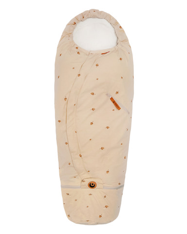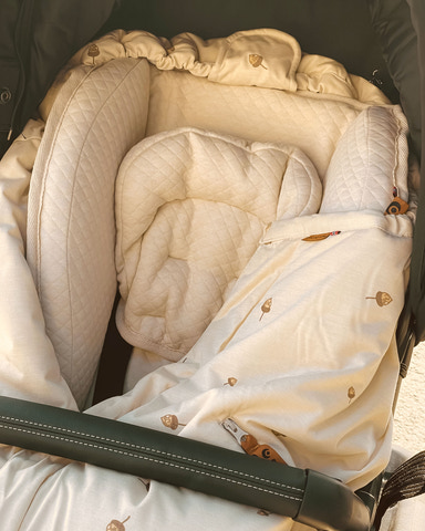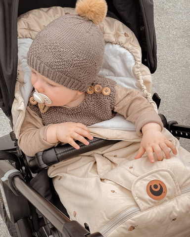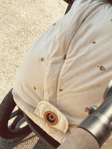 Køreposen er lavet af genbrugsmaterialer og økologisk viskose af bambus. Posen kan forlænges og har således en lang levetid.