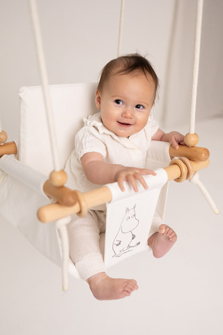 Moomin Baby Gynge – Perfekt til indendørs og udendørs brug, denne gynge har et hyggeligt sæde prydet med den elskede Mumin-karakter, der tilføjer et strejf af finurlighed og komfort. Den neutrale beige farve og naturlige træelementer blander sig problemfrit med enhver boligindretning, hvilket gør den til en stilfuld tilføjelse til dit barns børneværelse eller legerum.