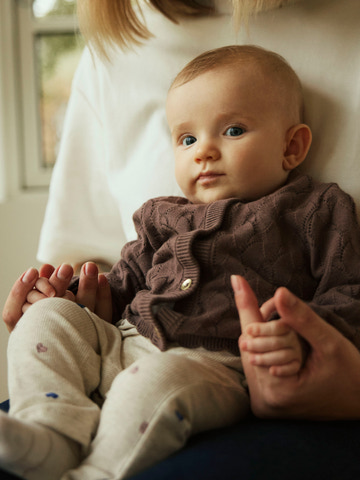 Giv dit barns garderobe et strejf af elegance med denne fine cardigan i pointelle-strik. Det åbne, geometriske mønster giver et let og luftigt udtryk, mens den bløde kvalitet sikrer høj komfort – perfekt til både hverdag og særlige lejligheder.