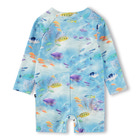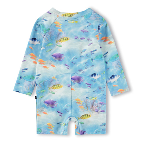 Neka Badedragt fra Molo er perfekt til sjov i vandet! Den har flotte regnbuefarvede fisk og lange ærmer, som beskytter mod solen. Lavet af blødt polyester og elastan, så den er behagelig at have på.