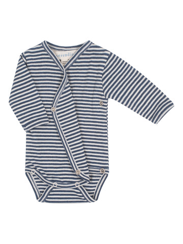 Stribet slå-om body med trykknapper til baby første tid. Smalle striber. Syet af blød økologisk bomulds rib.