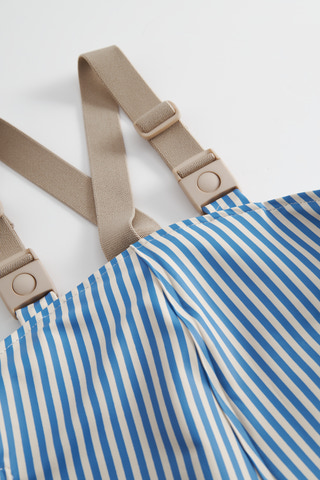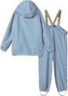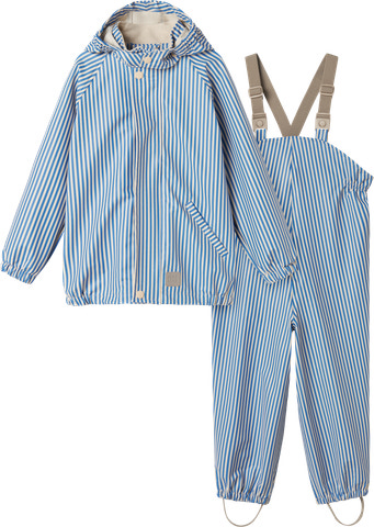 Dette regnsæt til børn er både praktisk og komfortabelt. Regnbukserne er udstyret med seler og elastik i siderne, så de altid sidder godt og sikkert. Jakken har en praktisk forlomme og lukkes med lynlås samt trykknapper for ekstra beskyttelse mod vind og vejr.