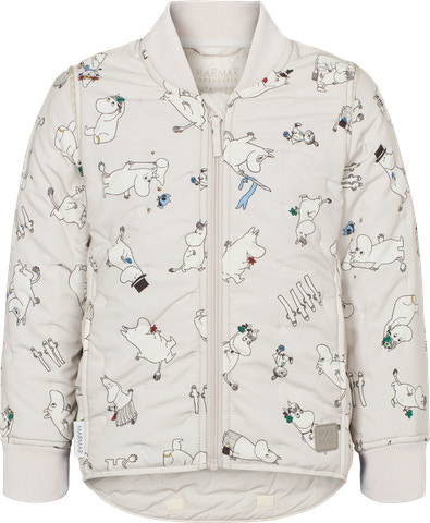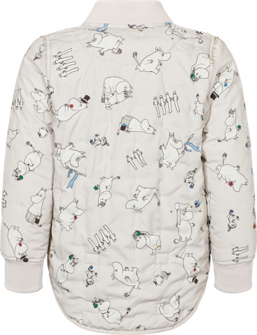Termojakke med Moomin print med smal pasform og med lommer i siden. Jakken kan ved hjælp af små velcro detaljer bukkes op bagpå, hvis man ikke ønsker at den er længere her. Jakken lukkes med lynlås