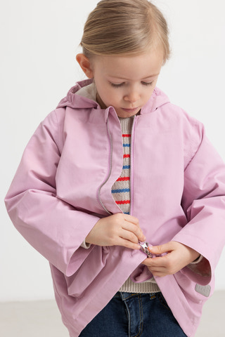 Denne overgangsparka til børn har en rummelig og behagelig pasform og er udstyret med to praktiske lommer samt en aftagelig hætte. Jakken lukkes med lynlås foran og er både vind- og vandtæt – perfekt som en let og funktionel forårsjakke.
