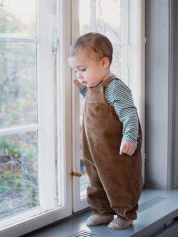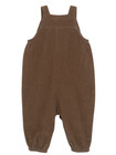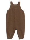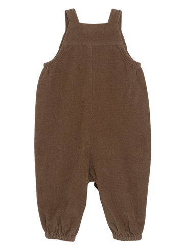 Overalls til baby i en smuk nøddebrun fløjl. Design med lille bærestykke og rynk i siderne for at understrege baggy design. Åbnes med trykknapper ved skulderstropper i benåbningen samt elastik ved anklerne. 100% økologisk bomuld. GOTS certificeret.
