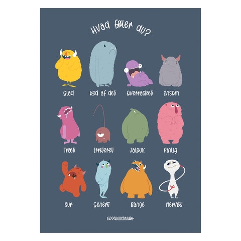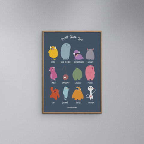Plakat - De Tolv Følelser blå 50x70 fra Poster & Frame gør det sjovt og nemt for børn at tale om følelser. De søde figurer viser følelser som glad, sur og nervøs. Perfekt til børneværelset eller institutionen. Gør samtalen om følelser hyggelig og tryg for dit barn. • Lærer om følelser • Farverig og venlig • Størrelse: 50x70 cm Se mere fra Poster & Frame her: