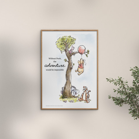 Sød plakat med Peter Plys og venner på ballon eventyr fra Poster & Frame. Perfekt til børneværelset! Skaber hygge og eventyrstemning med de elskede figurer.