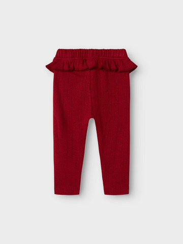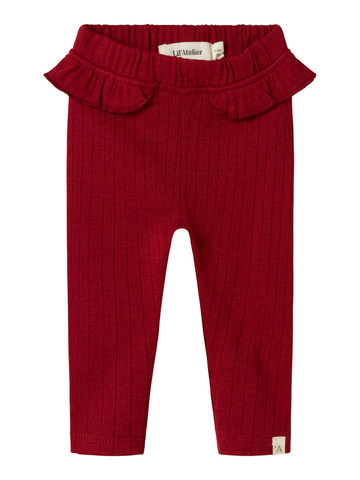 Rachel Leggings fra Lil' Atelier er et skønt valg til både hverdag og fest. De er designet i en flot, dyb rød nuance, der giver et elegant og moderne udtryk. Den bløde og strækbare kvalitet sikrer, at dit barn kan bevæge sig frit og komfortabelt hele dagen. Den fine flæsekant ved taljen tilføjer et feminint og legende touch, mens den ribbede struktur giver ekstra komfort og et stilfuldt look. Med den elastiske talje er leggingsene nemme at tage af og på, og de sidder godt uden at stramme. Rachel Leggings passer perfekt til både body, bluse eller kjole og kan bruges året rundt.