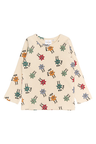 kundeservice@pixizoo.dkDenne rib-t-shirt fra THE NEW Siblings kombinerer komfort med et sjovt og farverigt design. Fremstillet af blødt og strækbart ribstof, har den et all-over print af små stjernetegn og teksten "Hey you", som tilføjer et legende touch. Den tætsiddende pasform gør den perfekt til hverdagsbrug eller som et lag under en cardigan eller sweatshirt.